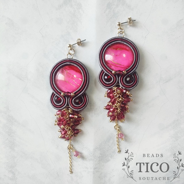 こちらはヨーロッパの伝統的なコード刺繍「ソウタシエ」を用いた作品となっております。 中世ヨーロッパの貴族に親しまれ、リボンやレースなどと同様に古くから多くの人に愛されてきた手法です。 専用のコードを使い、全て手縫いで作っております。 コードはとても軽いので、大振りの作品や長時間の使用でも痛くなりにくいです。 センターのパーツにはアルコールインクアートのカボションを使用しております。 同じパーツが作れないため、世界で一つだけの一点物のアクセサリーになります。 こっくりとしたルビー色がとても艶やかなイヤーアクセサリーになっております。 毎日の普段使いにも、大事な場面にも使って頂くことができると思います。 ♡オススメの使用シーン♡ ・ここ一番の勝負に! ・無敵になりたい時に! ・普段使いなどに ・自分だけのお守りとして あなたをそっと後押しできる、そんなアクセサリーになれるとうれしいです。 【素材】 ビーズ・ガラスビーズ・チェコビーズ・ソウタシエコードなどを使用しております。 裏面は合皮となっております。 【サイズ】 全体 約 60 mm× 30 mm 【金具について】 18k(塗り)を使用しております。 ポストピアスのみ有料にてサージカルステンレスピアスも対応しております。 金具変更よりお選び下さい。 【金具変更について】 ご希望の金具に変更可能です。 オプションから必ず選択してください。 選択されていなかった場合はポストピアス仕上がりとなります。 〇フックピアス 〇ポストピアス(標準) 〇サージカルステンレスピアス(+100円) 〇イヤリング 【お手入れについて】 フェルト・合皮で作ってある為、丸洗いは御遠慮ください。 また汗などがついたままですと、金具・ビーズなどの偏食に繋がります。 ご使用後は柔らかなタオルで拭くなど、お手入れして頂けると長く使って頂けます